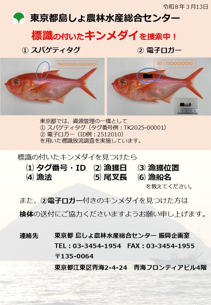 を用いた標識放流調査を実施しています。標識の付いたキンメダイを見つけたら、